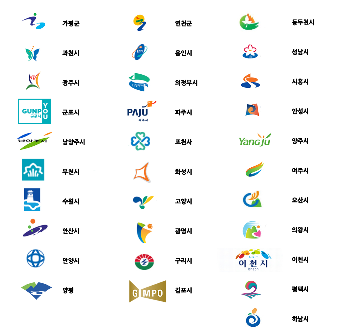 이니셜을 사용한 곳은 고양시, 양평군, 연천군, 구리시, 시흥시가 있습니다. 고양시 CI의 경우 한글 ‘고’와 ‘양’의 형태를 혼합, 변형시킨 심볼을 사용합니다. 그리고 색상이미지를 통해 강과 산, 시민들의 조화와 화합을 형상화하였습니다. 양평군의 경우 영어 이니셜 ‘Y’를 사용하여 용문산 은행나무를 표현하였습니다. 그 안에 남한강, 북한강의 합류를 나타내었고, 중앙에 태극마크를 사용하여 조화를 표현하였습니다. 마찬가지로 맑은 물과 푸른 자연을 상징하는 파란색과 녹색을 사용하였습니다. 연천군은 노란색 타원으로 한글 ‘ㅇ’을 표현하였으며 붓으로 쓴 것과 같은 형태로 ‘ㅊ’을 표현하였습니다. 적색돌기는 도약의 의지와 밝은 미래상을 상징하며, 이외에 청색, 녹색을 사용하였습니다. 구리시는 원안에 ‘ㄱ’, ‘ㄹ’을 변형시켜 사용하였습니다. 녹색은 전원도시를 의미하며, 상단의 빨간색은 태양을 의미합니다. 그리고 그 안에 8개의 선은 수송과 교통체계의 거점 도시임을 뜻합니다. 왜 8개의 선을 사용하였을까요? 구리시에서 ‘8’이 주는 의미는 좀 더 확인해봐야 할 것 같습니다. 심볼마크의 의미에 특정 숫자가 포함되는 경우가 종종 있습니다. 이런 경우 보통 로고의 주체가 강조하는 바가 있기 때문입니다. 그게 아니면 ‘태양’을 표현하기에 적절한 선의 배치가 8개일지도 모르겠습니다. 시흥시의 CI 또한 이니셜 ‘S’가 사용되었습니다. 심볼의 중심색상인 오렌지색과 청색으로 이니셜을 표현한 것이 아닌 둘을 관통하는 흰색 선을 사용했다는 점이 재미있는 것 같습니다. 이니셜 ‘S’를 통해 시흥시의 발달된 시원한 도로망을 보여줍니다. 오렌지색은 태양을 청색은 서해와 인접한 시흥시의 풍요로운 자연환경을 표현하였다고 합니다. 보통 청색은 직접적으로 물을 표현하는 경우가 대부분인데 청색을 통해 ‘서해와 인접한 자연환경’을 표현한다는 점은 새로운 접근인 것 같습니다.