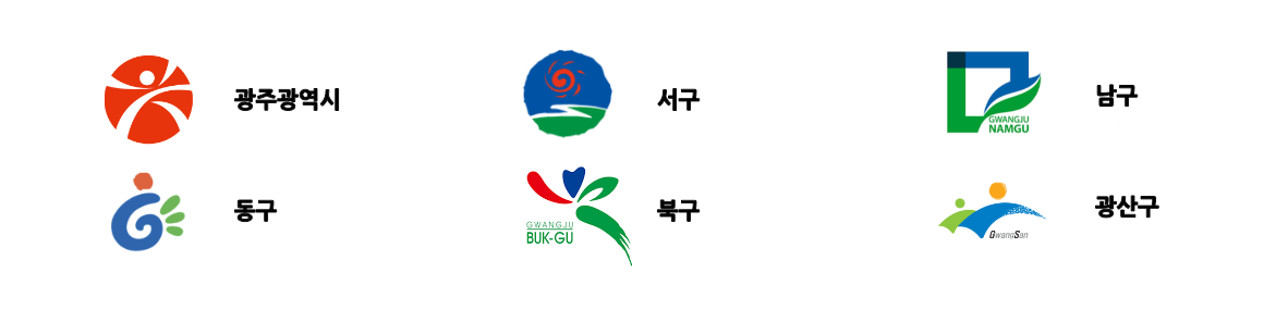 단일 색상을 사용한 광주광역시를 제외하고는 나머지 5개의 지역구에서는 모두 공통적으로 파란색과 녹색이 사용된 것을 볼 수 있습니다. 그리고 빨간색이 3개 지역구에서 사용되었으며, 서구와 동구는 상단에 위치시켜 태양을 표현하였습니다. 광산구도 태양을 표현하였지만 색상은 빨강색이 아닌 주황색을 사용하였습니다. 오히려 주황색을 사용하면 광산구에서 사용한 녹색과 파란색의 톤과 더 잘 어울리는 것 같습니다.