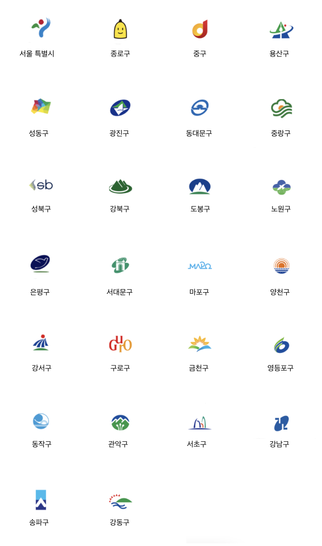 영등포구의 로고는 한글 자음 ‘ㅇ’을 활용하였으며, ‘O,X’의 ‘O’, 영어 ‘OK’의 ‘O’를 표현하였습니다. 파란색 원은 ‘중심적 위치’를 담았으며, 초록색을 활용하여 새싹과 푸른 한강을 형상화 하였습니다. 현재 사용되는 중구의 로고는 2013년부터 사용되고 있습니다. 원을 통해 서울의 중심이라는 의미를 담았습니다. 또한 Junggu의 이니셜 J를 빨간색을 사용하여 같이 표현하고 있습니다. 빨간색은 활기와 열정을 보여줍니다.